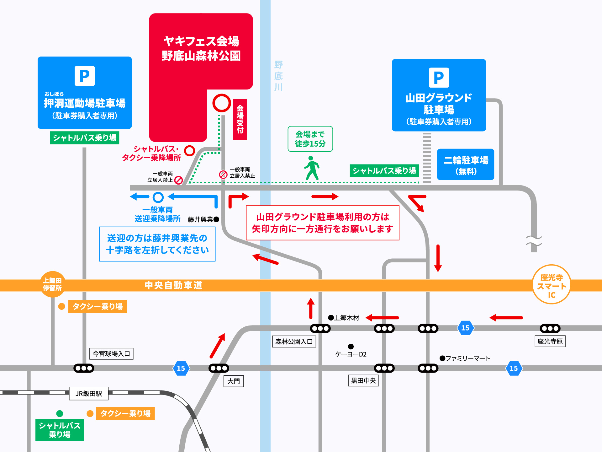 飯田駅前、山田グラウンド駐車場、押洞運動場駐車場より有料シャトルバスが随時運行します。