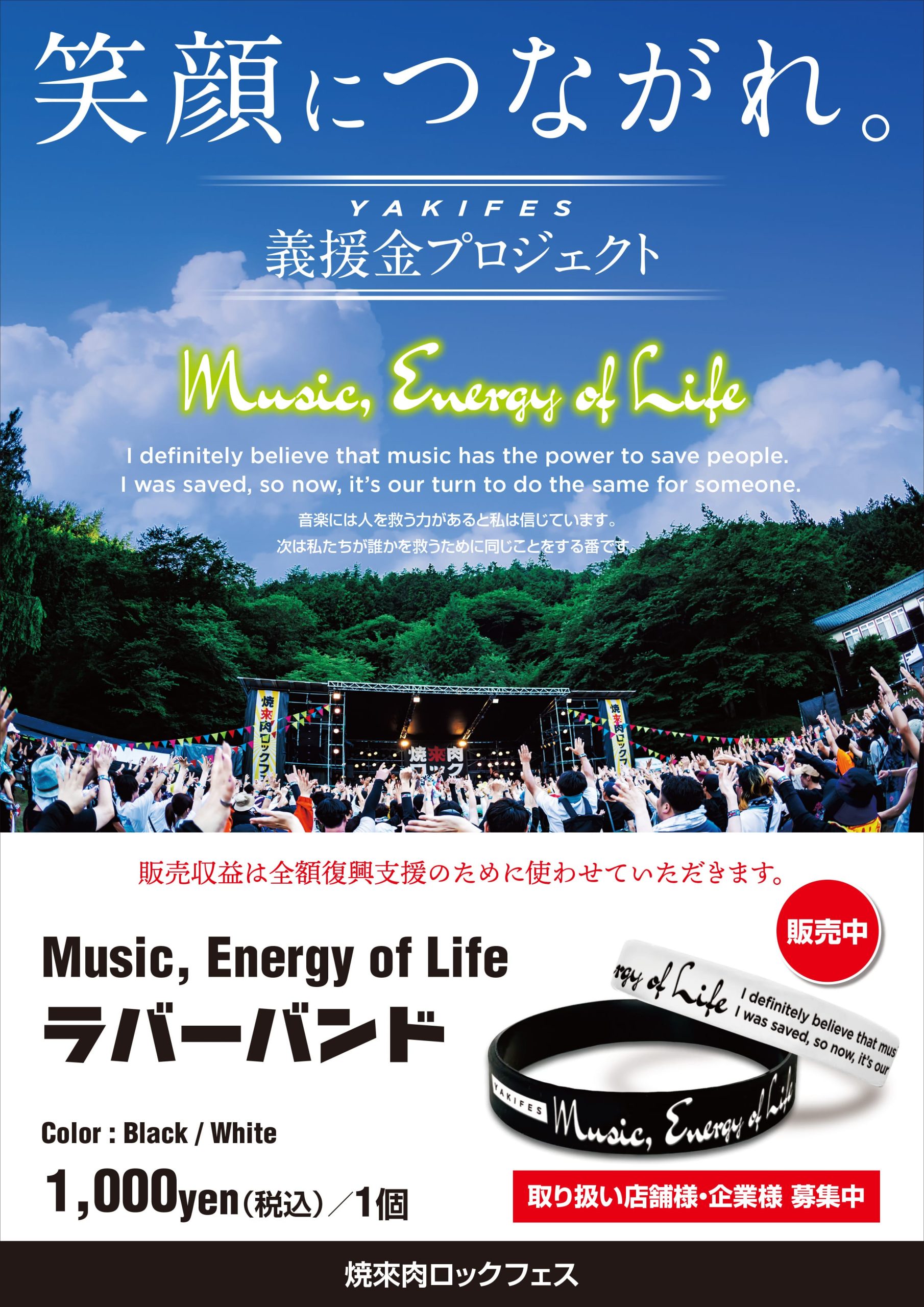 【販売期間】3月29日~ 【販売内容】ラバーバンドの販売(黒/白)@1,000円(税込み) 【寄付内容】販売で得た収益全額を必要なところへ義援金として寄付させて頂きます。